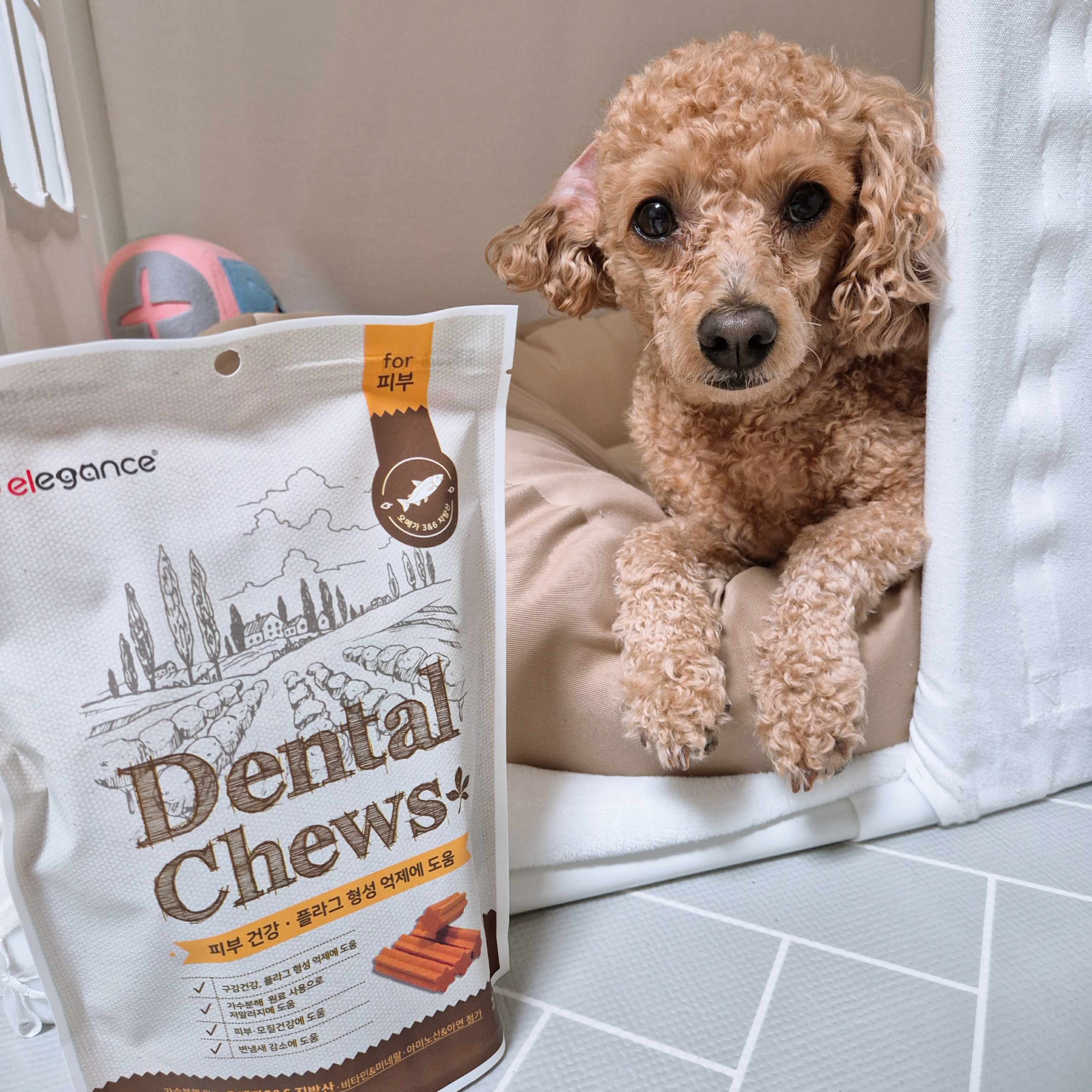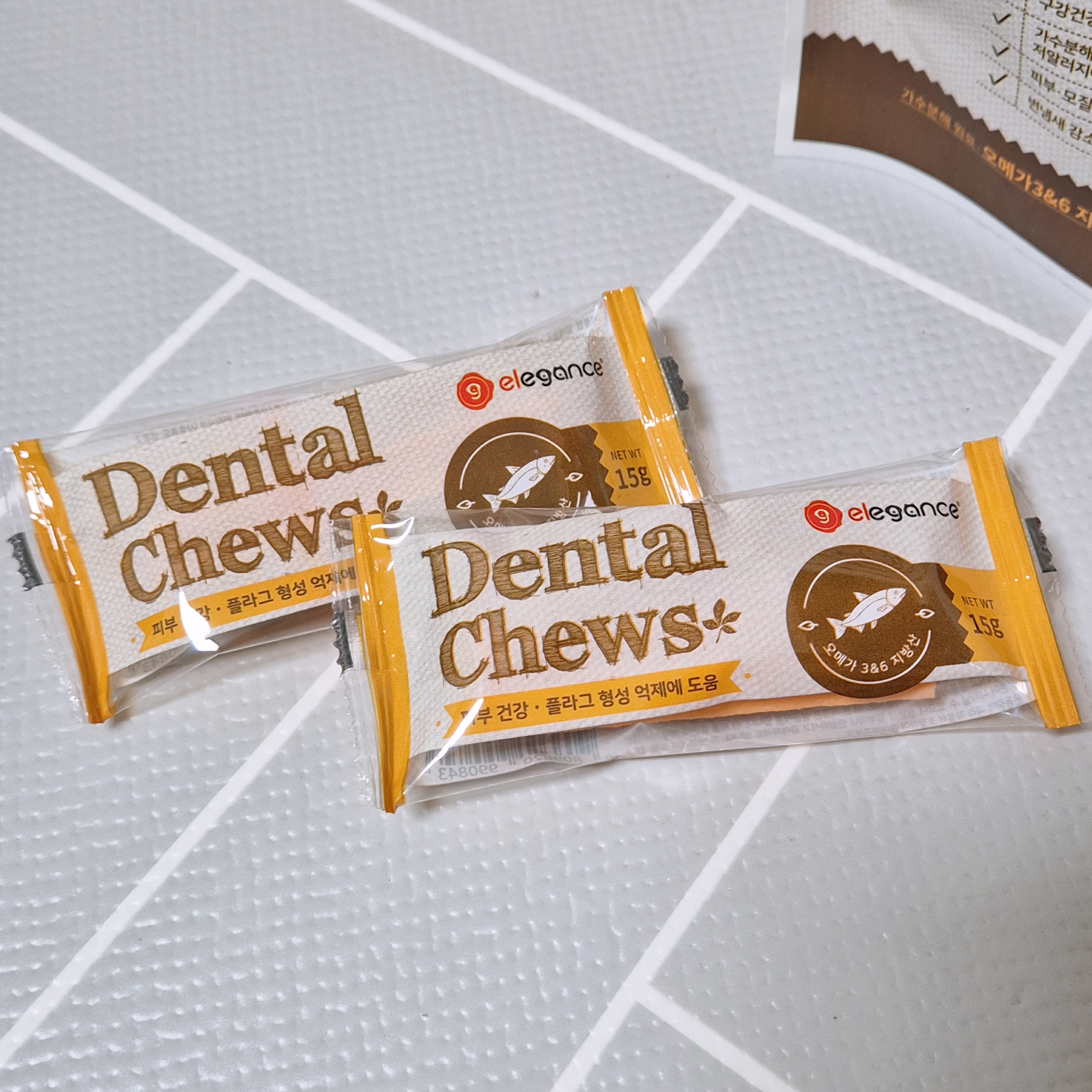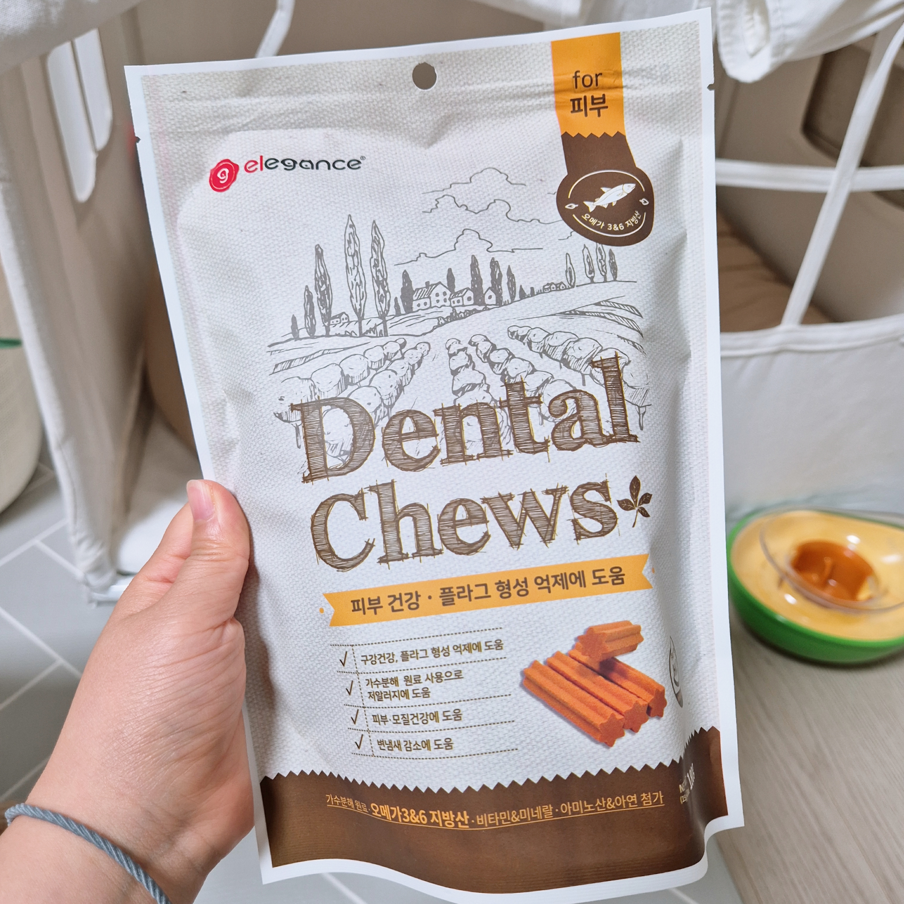 엘레강스 덴탈츄는 처음이라 우선 한개만 급여했는데, 하나 맛있게 쩝쩝꿀꺽 하더니