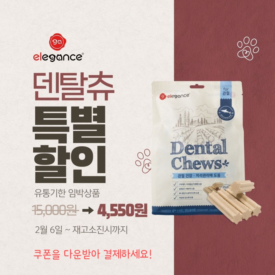 [유통기한임박]엘레강스 저알러지 가수분해 간식 덴탈츄 관절건강 180g